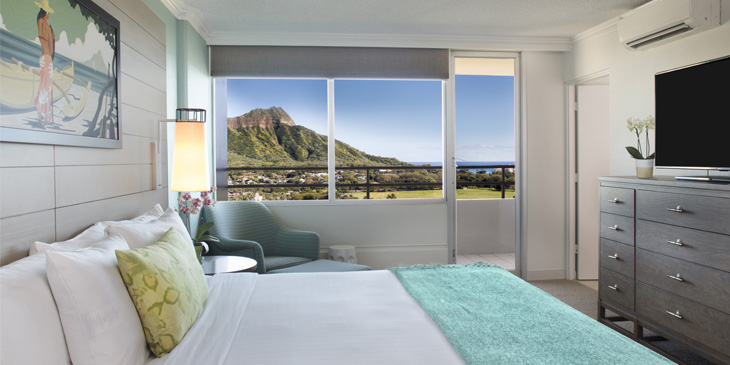 1ベッドルームのペントハウススイート・オーシャンビューのお部屋です。ワイキキビーチの景色をお楽しみいただけます。クイーンベッド2台、またはキングベッド1台のお部屋をご用意しております。エキストラベッドはリクエストにより追加可能。